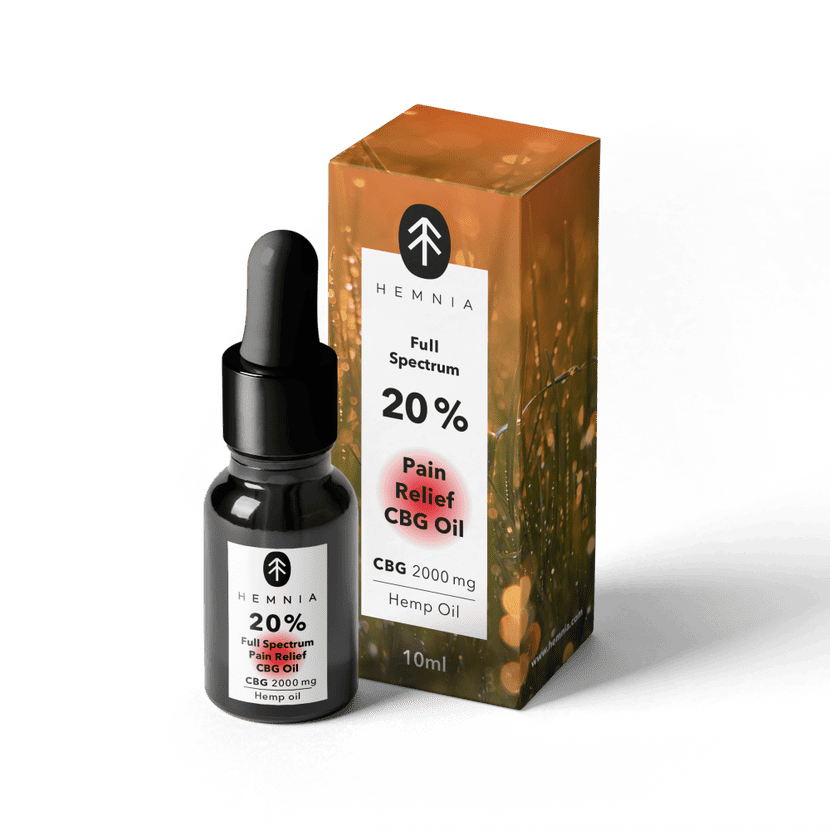 CBG olej Pain Relief od společnosti Hemnia s obsahem 20 % CBG a 5 % CBD.